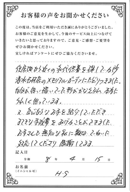 この度は心温まるお葉書をお送りいただき、誠にありがとうございます。 数ある永代供養の中から当霊園をお選びいただき、また「思い描いていた形になった」とのお言葉を頂戴し、大変嬉しく拝見いたしました。 大切なご供養の場として、ご満足いただけるお手伝いができましたこと、心より光栄に存じます。 さらに、寺院葬についても安心して進めていただけたとのこと、そしてスタッフの対応にも温かいお言葉をいただき、深く感謝申し上げます。 これからも安心してお任せいただけるよう、丁寧なご案内と対応に努めてまいります。今後ともどうぞよろしくお願い申し上げます。