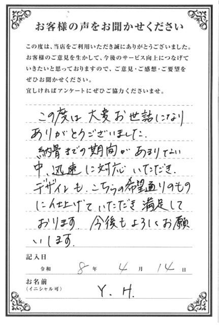 このたびは心温まるおハガキをいただき、誠にありがとうございました。 身近に頼れる方がいらっしゃらずご不安も多かったことと思いますが、 少しでもお力になれたことを大変光栄に感じております。 「本当に助かった」「皆様やさしい方ばかり」とのお言葉を頂戴し、 スタッフ一同も大きな励みになります。 今後とも、安心してお任せいただける存在であり続けられるよう努めてまいります。 この度は当店へご依頼いただきまして、誠にありがとうございました。