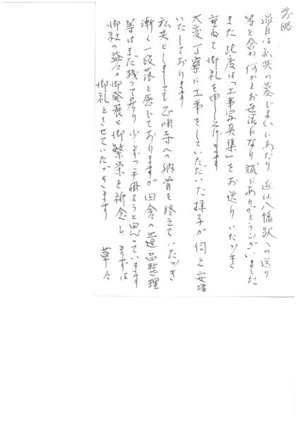 このたびは墓じまいのご依頼をいただき、誠にありがとうございました。 最後まで心を込めてお手伝いさせていただけましたことを、スタッフ一同光栄に思っております。 また、近江八幡駅までの送迎につきましてもお言葉をいただき、ありがとうございます。 遠方からお越しいただく中で、少しでもご安心いただけたようで何よりでございます。 今後も遺品整理などでもお力になれることがございましたら、どうぞお気軽にご相談くださいませ。 このたびは温かいお手紙をありがとうございました。